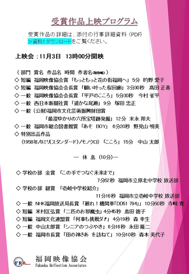 | 備考 | *令和7年度のコンテストの表彰並びに上映作品が決定しました。 受賞作品の詳細は、行事詳細資料(PDFファイル)をご覧ください。 *上映作品は学生さんを始めアマチュア映像作家の皆さんの心のこもった力作揃いです。 *特別出品作品として今年度上映される中山太郎作品は『こころ』<1958年/8ミリ/モノクロ/15分>です。他所では見ることの出来ない貴重な作品です。お見逃しなく! *皆様お誘い合わせの上、ご来場のうえご鑑賞下さい。 *その他、ご不明な点は福岡映像協会 中島(090-8350-7480)までお問い合わせください。 |